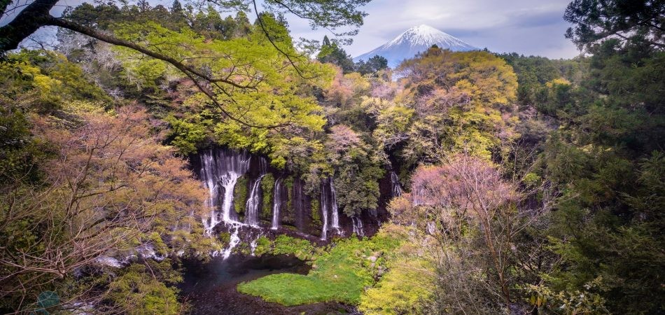 24. Thác Shiraito với view núi Phú Sĩ từ xa.