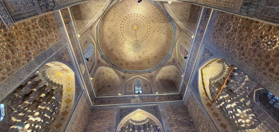 - Đoàn chụp ảnh lăng gia tộc đại đế Timur. Cổng vào được trang trí bởi mái vòm và họa tiết hình học trên nền gạch đất nung theo kiến trúc Ba Tư. Mái vòm được làm từ gạch tráng men màu xanh ngọc được trang trí hoa văn và dòng chữ Ả Rập với ý nghĩa “Thượng đế là bất tử”. Bên trong lăng mộ được mạ vàng và là nơi chôn cất đại đế Timur và các con cháu của ngài.