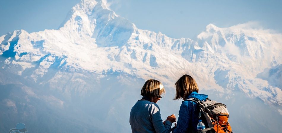 - Đoàn chụp hoàng hôn tại Dhampus với những đỉnh núi tuyết trắng phía xa nơi chân trời tuyệt đẹp.