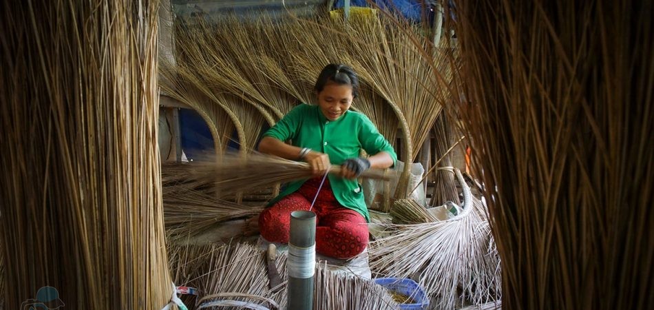 – Đoàn tham quan và chụp ảnh đời thường ở làng nghề làm chổi dừa. Để có được một chiếc chổi bền, đẹp thì phải trải qua nhiều khâu xử lý nguyên liệu, sự khéo léo của đôi tay người thợ. Dừa làm chổi phải được phơi khô để tránh ẩm mốc. Theo cách làm thủ công là tra bó vào cán, bện chổi, sau đó được kết chặt vào cán chổi bằng sợi mây. Hiện nay, để đáp ứng nhu cầu của thị trường, người dân đã đa dạng hóa với nhiều sản phẩm như chổi bện mây truyền thống, chổi quấn dây thép, dây cước, cán thân đót, cán nhựa, chổi quét vôi…