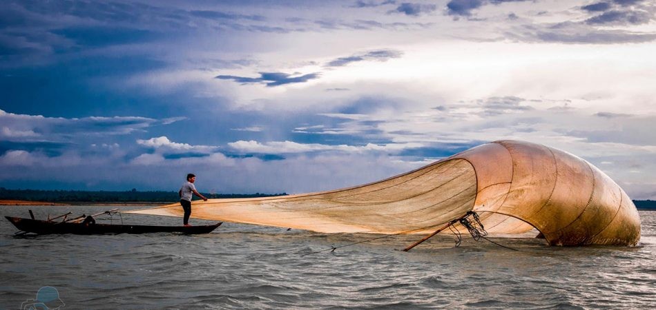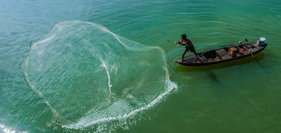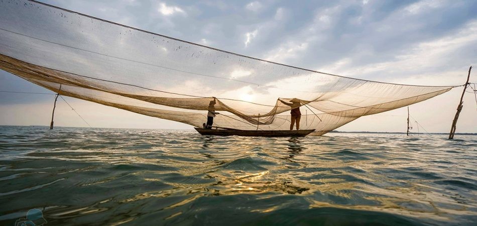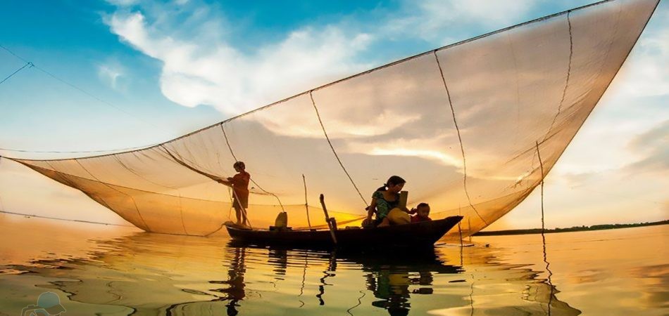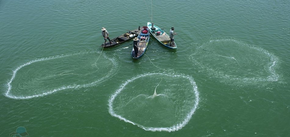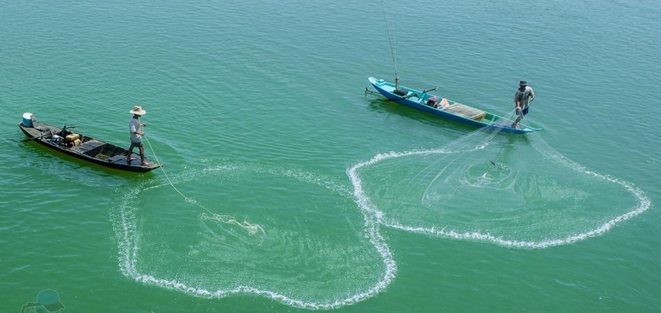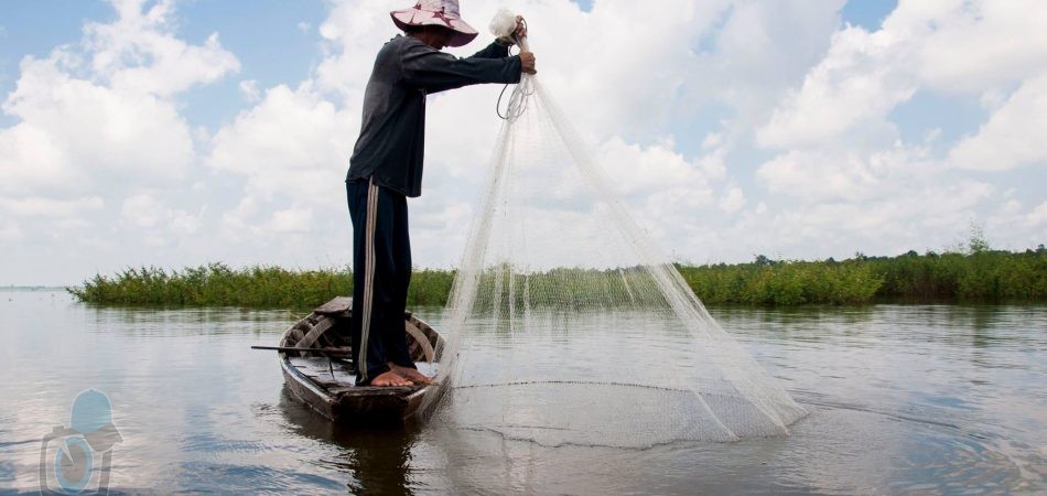 3. Cảnh quăng chài dưới mặt hồ trong xanh.