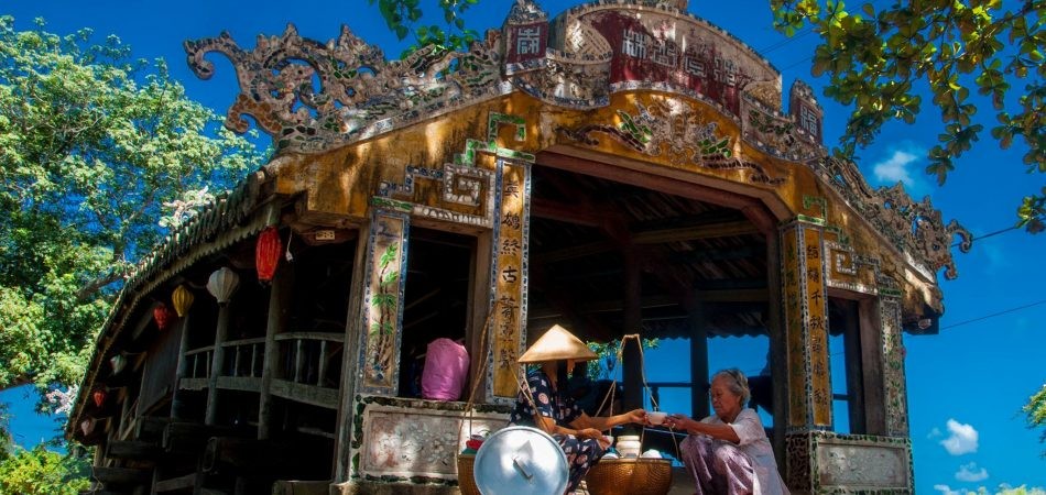 - Đoàn khởi hành đi chụp ảnh ở cầu ngói Thanh Toàn. Đây là một trong số ít những cây cầu sở hữu những nét kiến trúc vô cùng độc đáo theo lối “thượng gia hạ kiều”. Cây cầu ngói nổi tiếng ở Huế này được xây dựng vào năm 1776 nhờ công lao to lớn của bà Trần Thị Đạo, cho dân làng để tiện qua lại, là nơi dừng chân, nghỉ ngơi trên đường về mệt nhọc. Trải qua bao thăng trầm của thời gian và lịch sử cây cầu vẫn còn lưu giữ được những nét kiến trúc đặc trưng một thời.