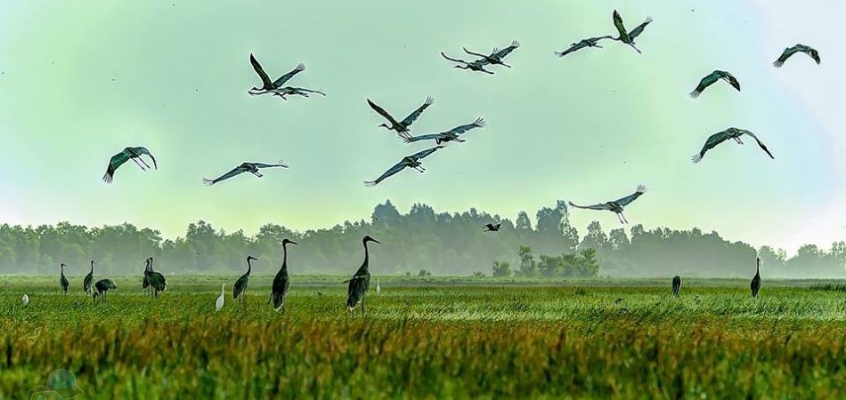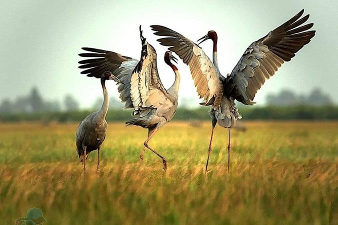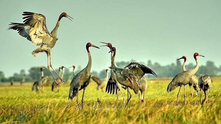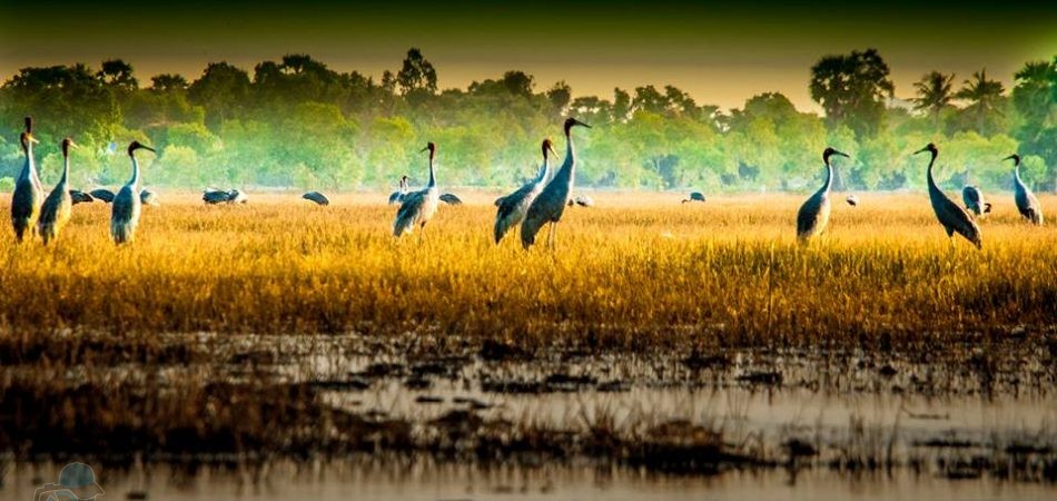 - Đoàn chụp hoàng hôn tại cánh đồng sếu đầu đỏ. Với chiều cao khoảng gần 1.8m, sếu đầu đỏ là loài chim cao nhất trong số các loài chim biết bay trên trái đất. Loài chim này dễ dàng được nhận ra bởi hầu hết cơ thể của chúng là màu xám bạc ánh thép, khi trưởng thành thì đầu, cổ trụi lông và có một màu đỏ rất nổi bật, đồng thời có vằn trên cánh, và đuôi một màu xám. Mỏ và trước đỉnh đầu màu xanh sừng, chân đỏ. Sếu đầu đỏ còn là sứ giả của môi trường, Sếu sống hiền hòa, chung thủy, đoàn kết… tượng trưng cho sự thanh cao và thánh thiện. Đặc biệt, tiếng bầy Sếu gọi đàn như khúc nhạc giao hưởng giữa cánh đồng năng bạt ngàn, và vũ điệu thướt tha của chúng dưới ánh hoàng hôn khiến du khách gần xa mê mẩn.